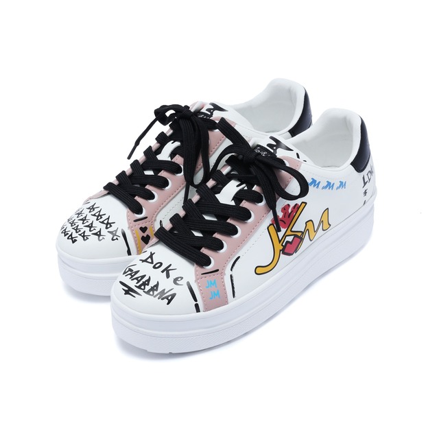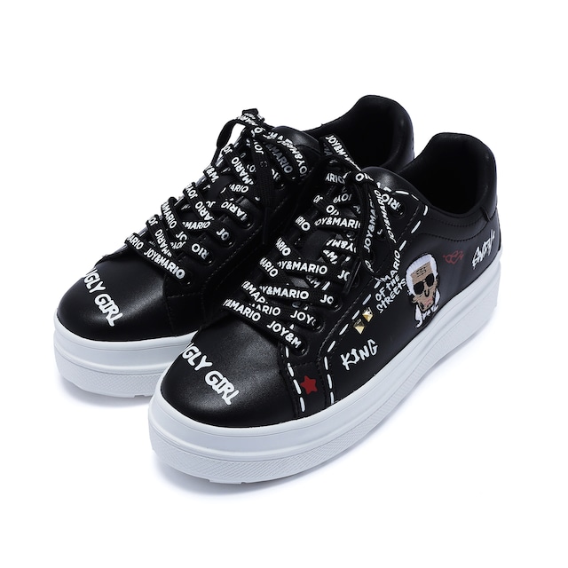 # 商品説明文 毎日のスタイルに遊び心をプラスする83700Wフェイスデザインスニーカーは、Joy&Marioのデザイナーが手掛けた個性的なフェイス柄が目を引く一足です。カジュアルながらも個性的なデザインが、シンプルなスタイルにスパイスを加えます。軽やかな履き心地と高いクッション性のソールが、日常のアクティブなシーンでも快適さをキープ。履きやすさとデザイン性を両立させた、あなたのワードローブに欠かせないアイテムです! ■カラーとサイズ展開 ・色はBLACK、WHITEの2色展開 サイズは35(22.5cm)~40(25.0cm)の5サイズ展開です。ぜひお好みのサイズをお選びください。 ヒールの高さ 4.0cm 靴幅 2E(普通) プラットフォームの高さ(cm) 3.5cm ヒールの形 フラットヒール つま先の形状 ラウンド クロージング レースアップ 裏素材 合成皮革 中敷素材 合成皮革 ソール素材 合成 ■お手入れと取り扱いの注意 ・汚れた際は、乾いた布で優しく拭いてください。 ・直射日光の当たる場所や高温の場所での保管は避けてください。 ■発送および注文に関する情報 ・ご注文後、3営業日以内に発送いたします。在庫切れの場合は別途ご連絡いたします。 ・サイズの交換はお受けいたしますが、返品はご遠慮ください。 ■その他の情報 ・ご使用のモニターや環境によって、実際の色味が異なる場合がございます。 ・サイズ感について不安な点がございましたら、お気軽にご相談ください。 ぜひ、この機会に83700Wフェイスデザインスニーカー をあなたのスタイルに取り入れてみてください!お問い合せは、ショップのお問い合わせページよりご連絡お待ちしております。