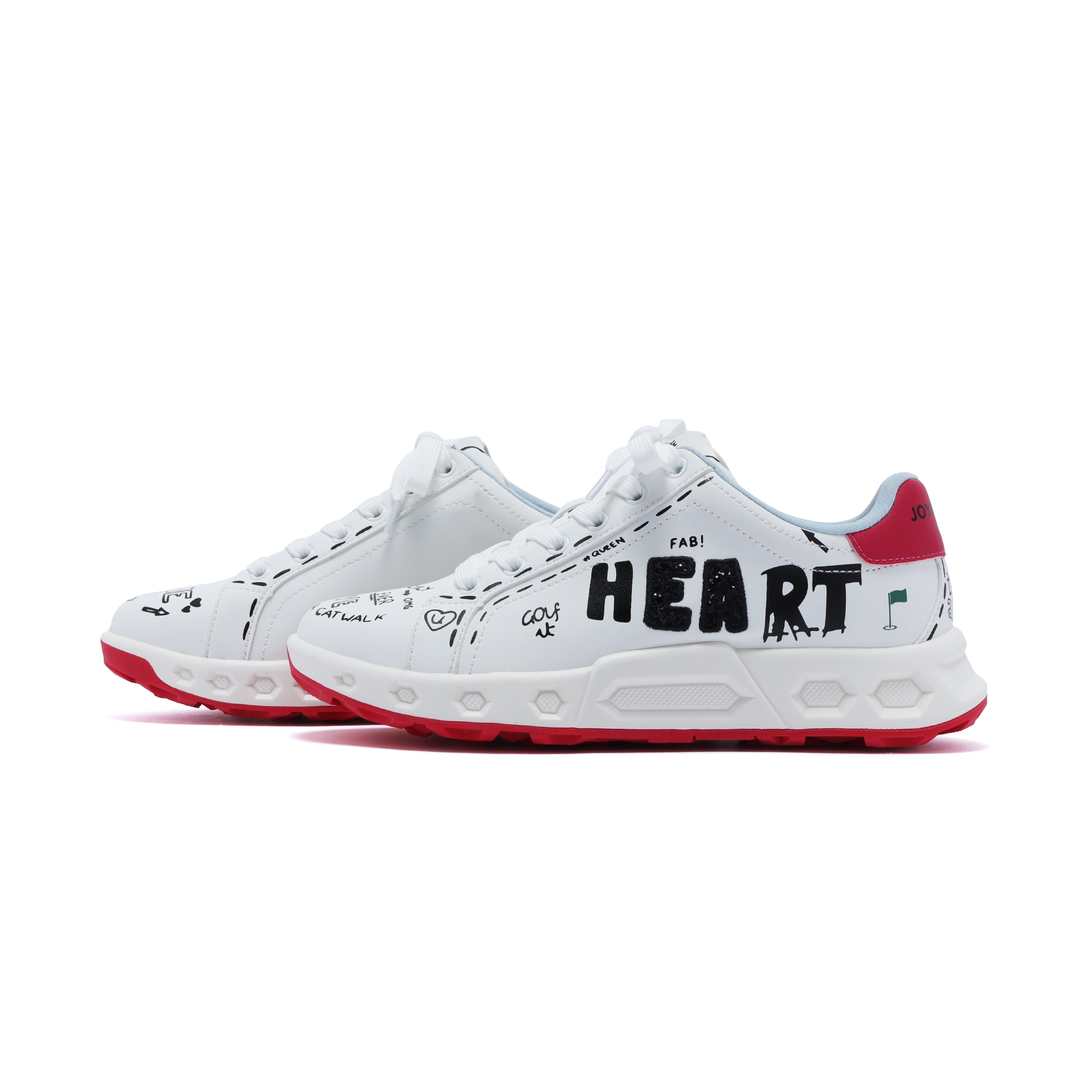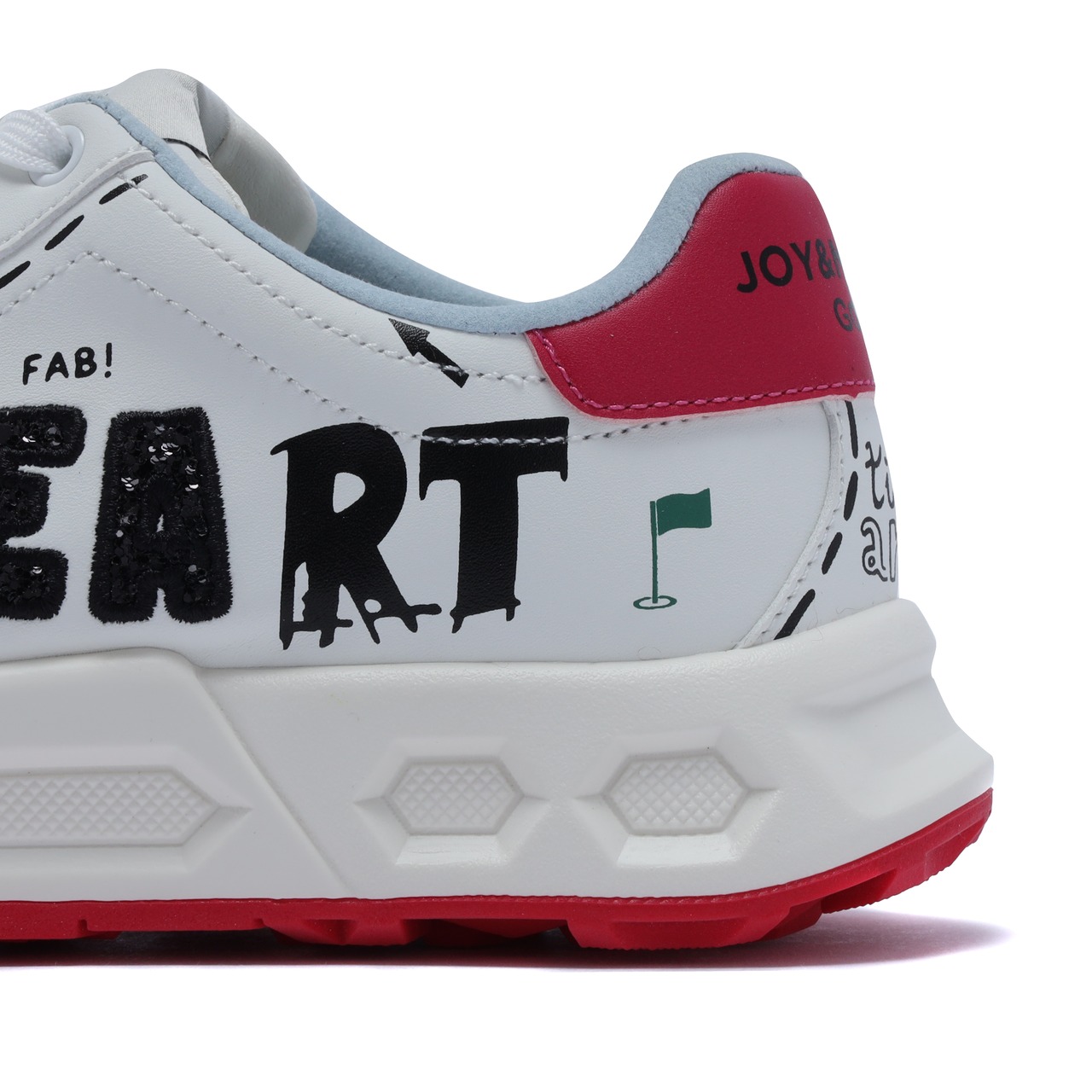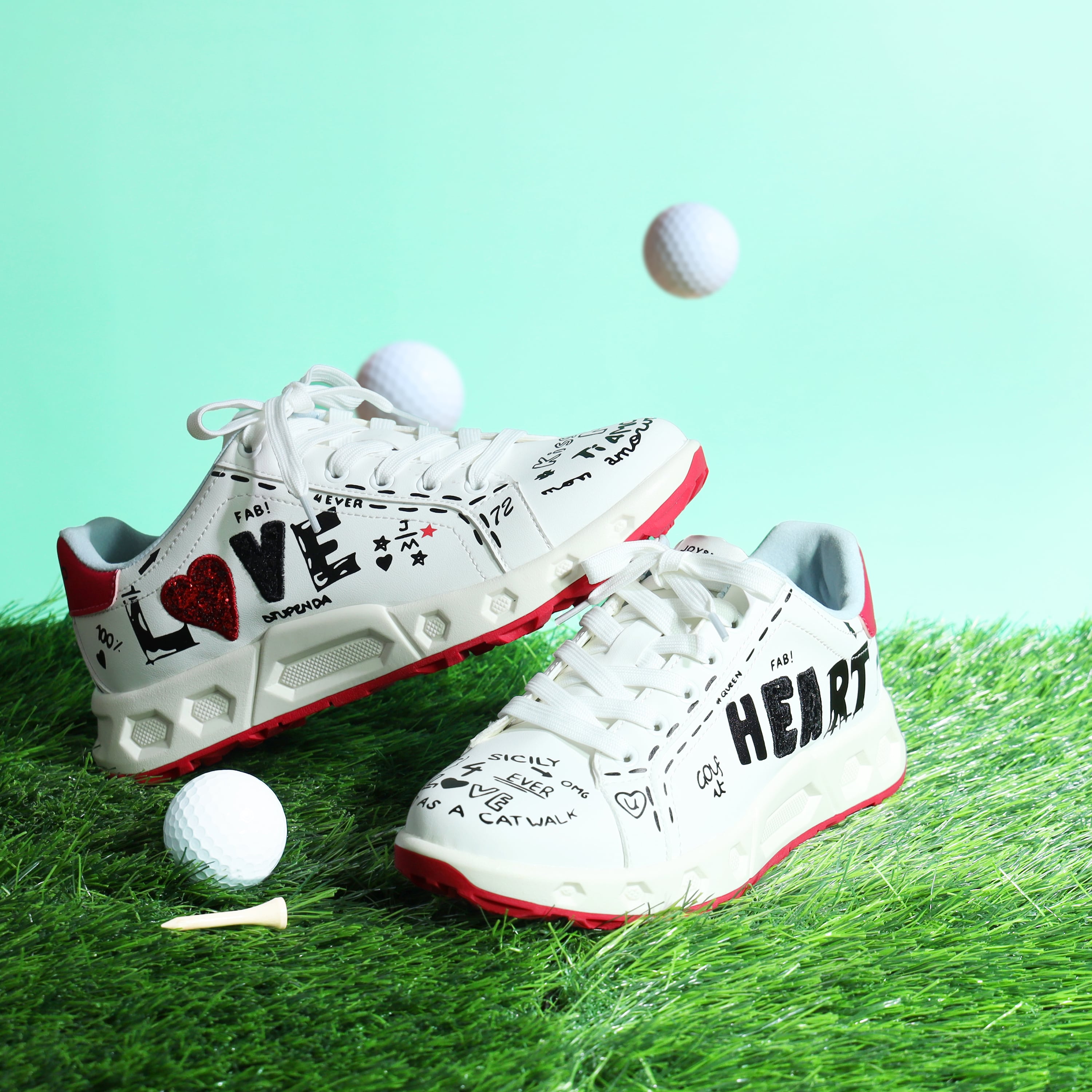 アシンメトリーな落書き調デザインが、コースでも視線を集める一足。左右非対称のグラフィックが足元に遊び心をプラスし、今までにないデザイン性を実現しました。