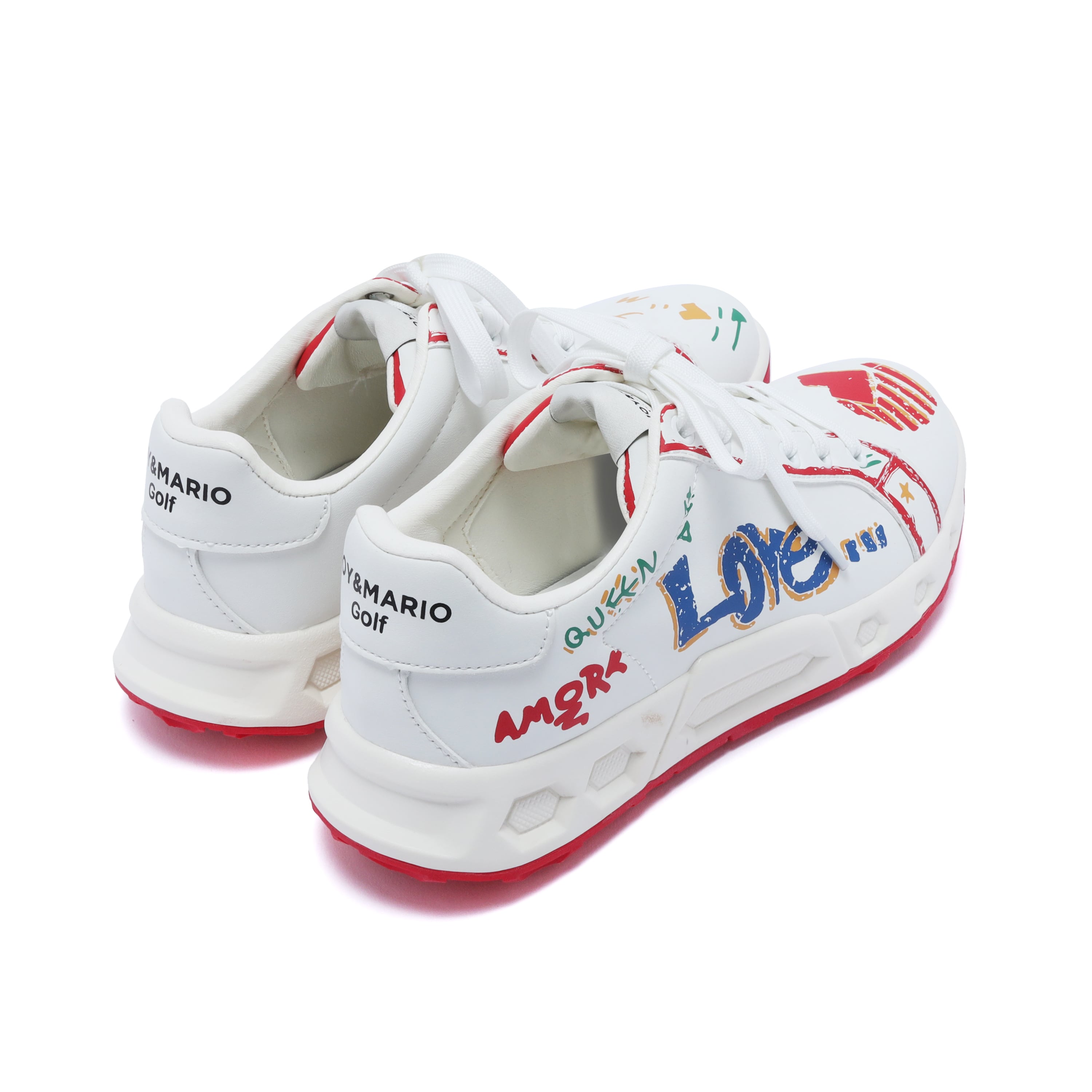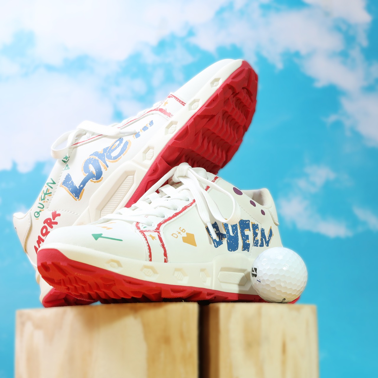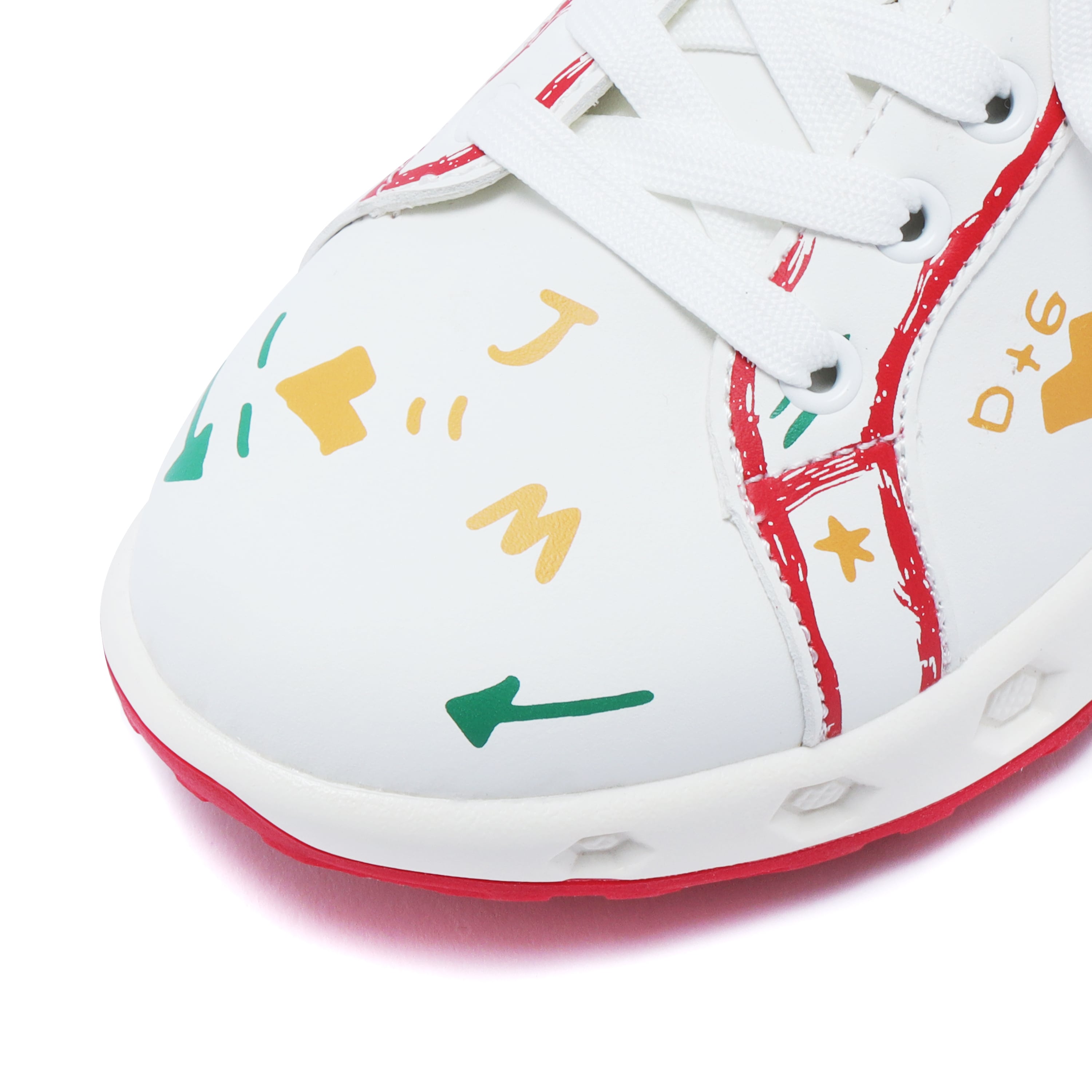 アシンメトリーな落書き調デザインが、コースでも視線を集める一足。左右非対称のグラフィックが足元に遊び心をプラスし、今までにないデザイン性を実現しました。