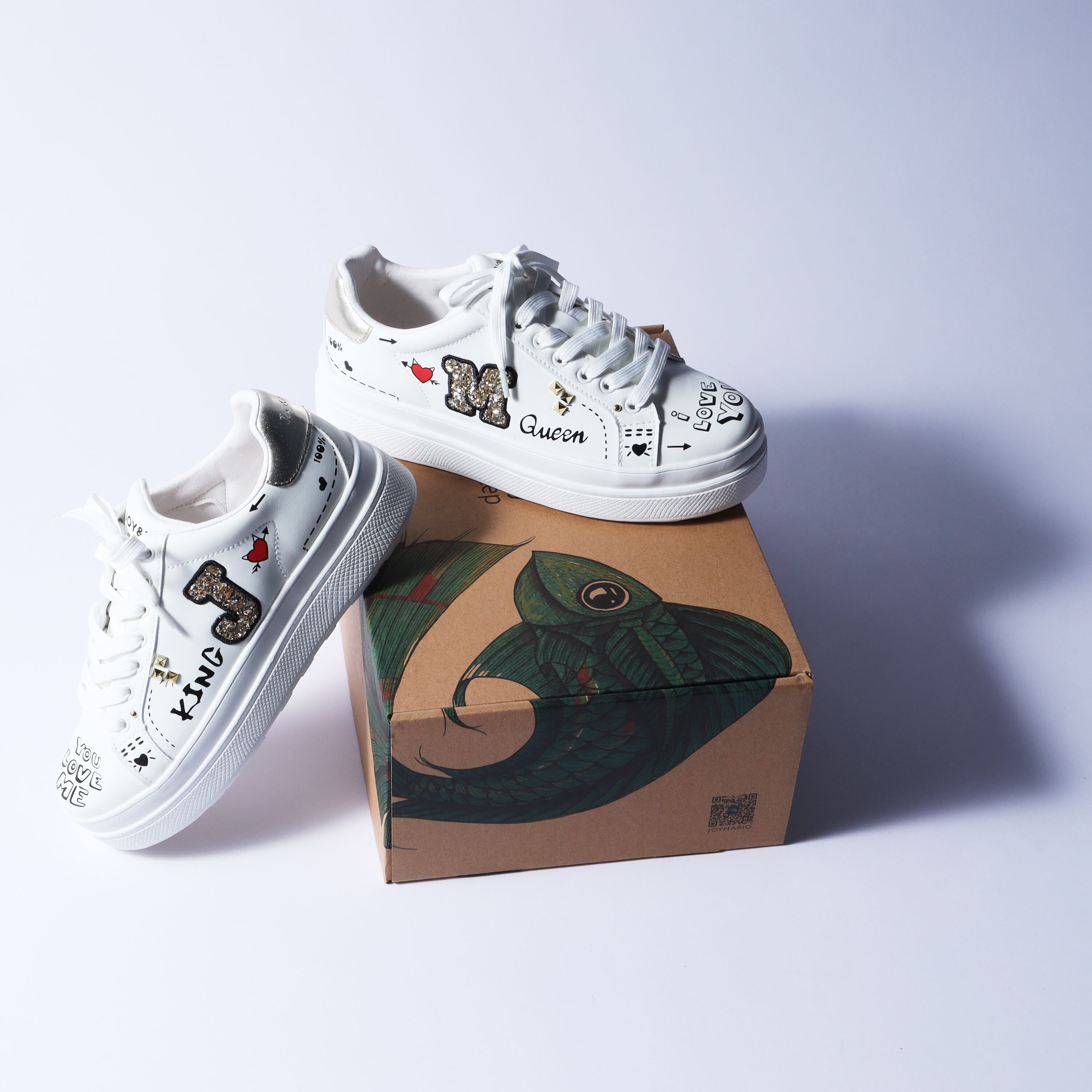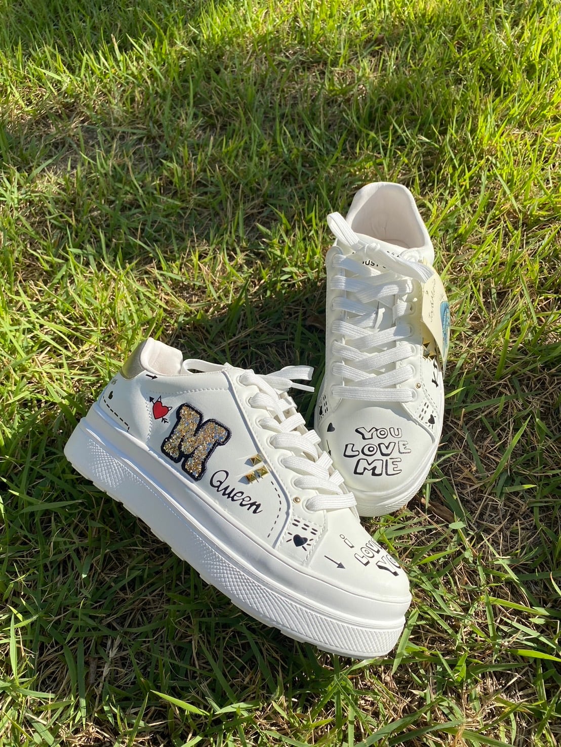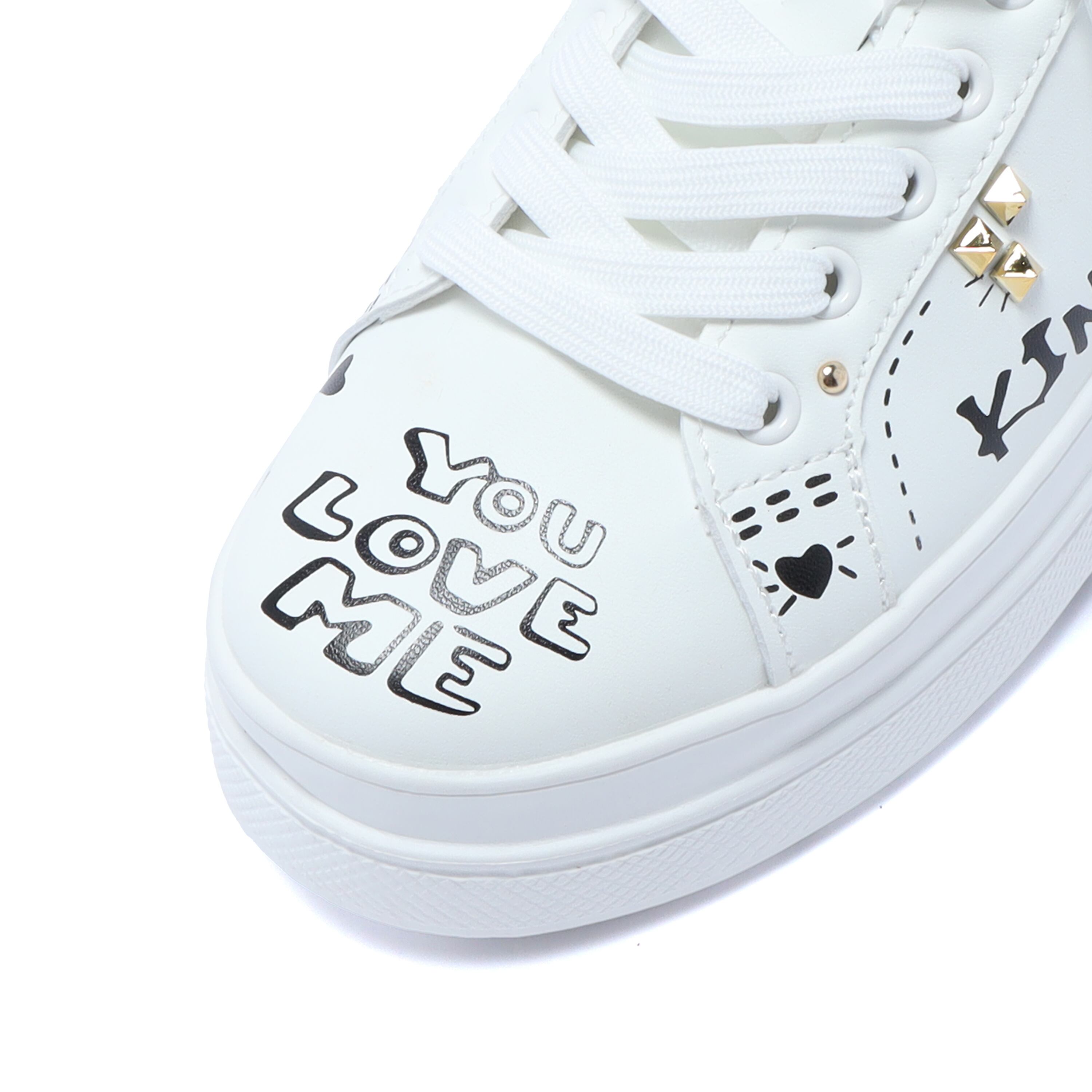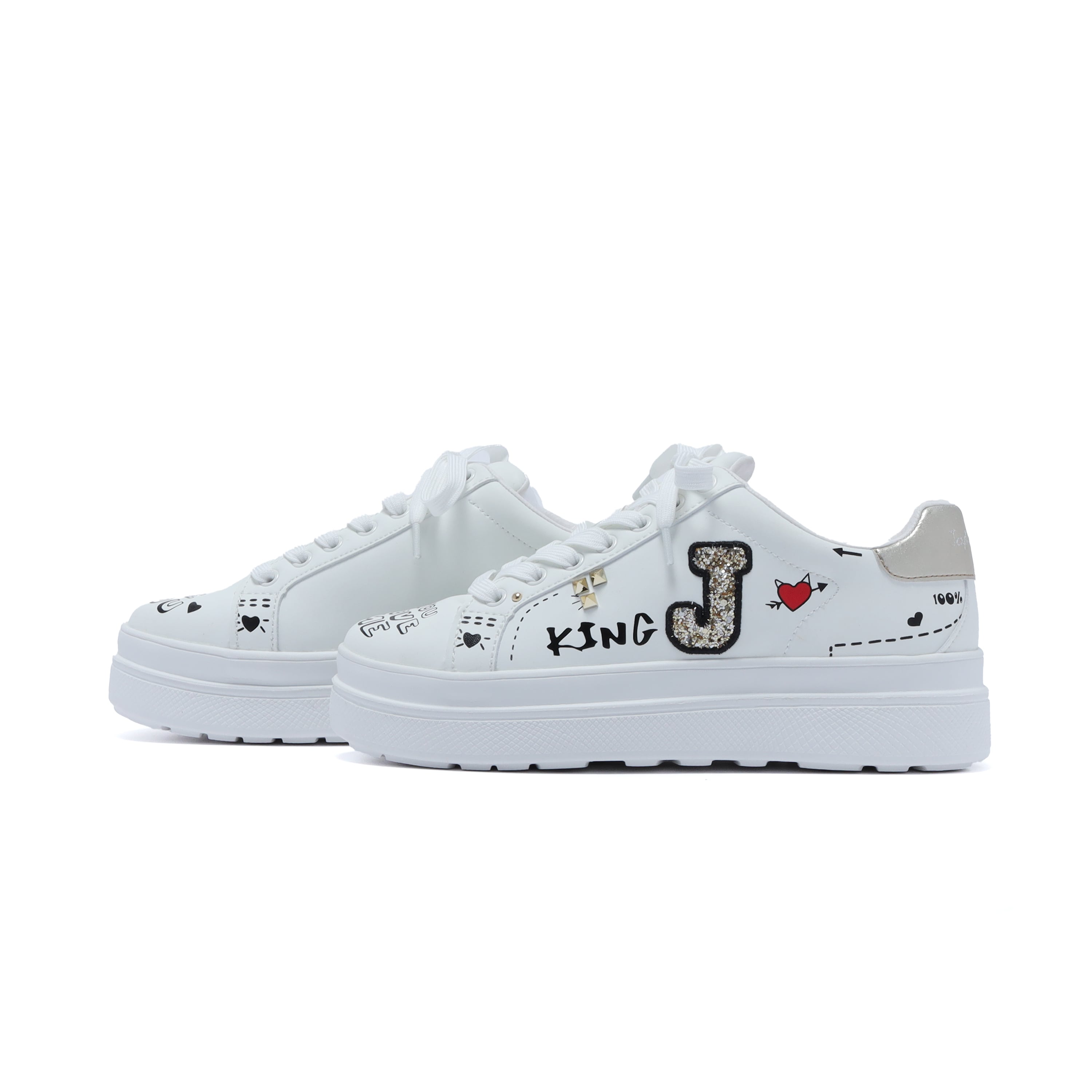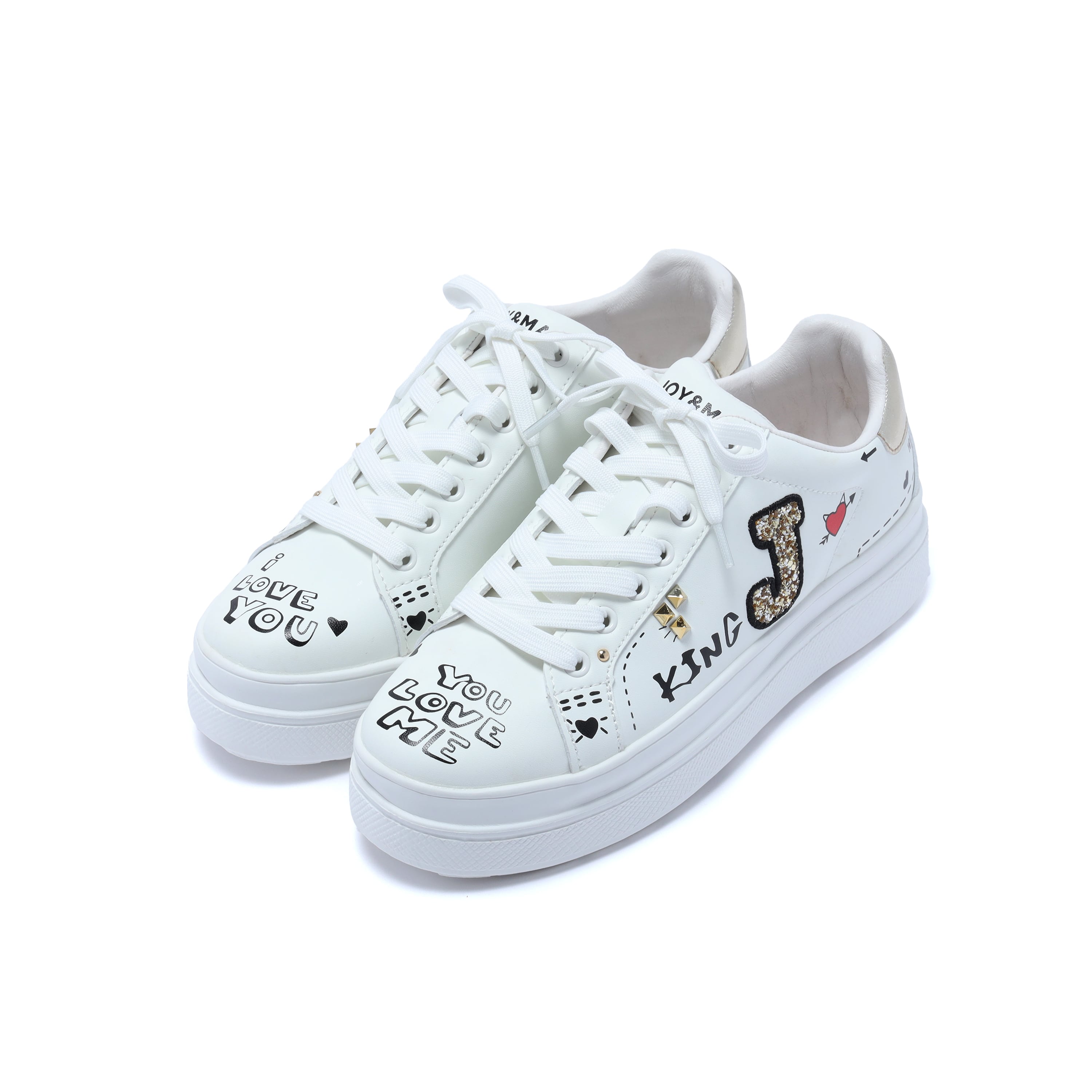 83626W厚底アシンメトリー落書き調スニーカーは、ユニークな落書きデザインとアシンメトリーなシルエットが魅力の一足です!厚底のため、スタイルのある足元を演出しつつ、履き心地の良さも兼ね備えています。スタッズのアクセントがさらに個性的な印象を与え、カジュアルスタイルはもちろん、おしゃれを楽しみながら快適に過ごせる履き心地です。